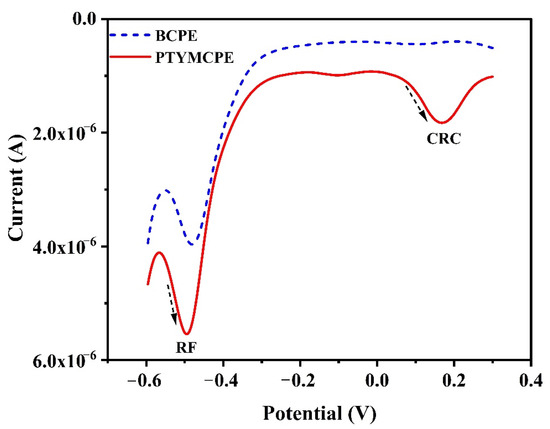 The simultaneous detection of CRC with RF has been carried out at PTYMCPE and BCPE through DPV. The electrochemical cell containing PBS of pH 6.5 was filled with the mixture of the solutions of CRC (1 × 10−5 M) and RF (1 × 10−4 M) for DPV analysis. Figure 8 shows DPV separation of CRC and RF at PTYMCPE (solid line) and BCPE (dashed line). PTYMCPE identifies CRC at 0.1729 V and RF at −0.493 with good current sensitivity. However, BCPE traces CRC at 0.090 V and RF at −0.480 V with low current signals. Therefore, PTYMCPE separates CRC and RF in a mixture as compared to BCPE.