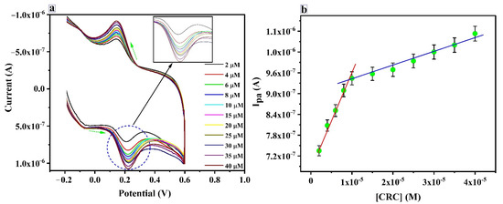 (a) CV curves for CRC detection from 2.0-40 µM (b) Calibration plot for the determination of CRC at the PTYMCPE in 6.5 pH PBS with the scan rate of 0.1 V/s.