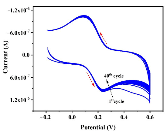 Cyclic voltammogram for the study of steadiness of CRC (1 × 10−5 M) at PTYMCPE in 0.1 M PBS (pH 6.5) for 40 cycles.