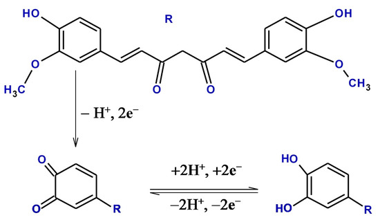 - Chen, C.; Xue, X.; Mu, S. pH Dependence of reactive sites of curcumin possessing antioxidant activity and free radical scavenging ability studied using the electrochemical and ESR techniques: Polyaniline used as a source of the free radical. J. Electroanal. Chem. 2014, 713, 22–27. [Google Scholar] [CrossRef]
