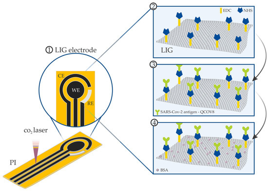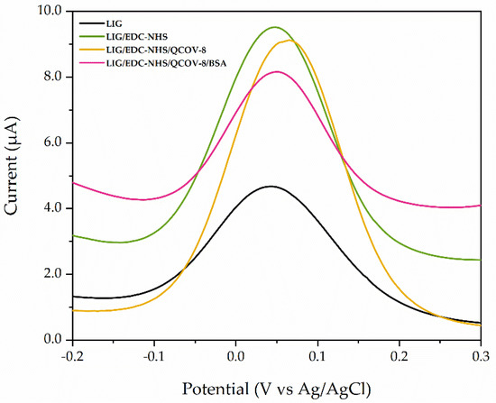 Firstly, DPV was performed to electrochemically characterize the electrode after each step of functionalization, and the results are shown in Figure 5. It is observed that the current increases and, subsequently, decreases as the sequence of functionalization process is carried out. The LIG electrode has a large charge diffusion due to its numerous ionic transport channels, as well as a high active surface area, which provides a good interaction with the electrolyte, resulting in good electrochemical response [23,33,34]. The use of EDC and NHS aims to assist the process of coupling chemical bonds between enzymes and functional groups of LIG through the immobilization of biomolecules with covalent bonds, optimizing the sensor sensitivity and increasing of the oxidation current. These compounds activate the carboxyl groups (–COOH) by direct reaction with primary amines (–NH2) through the formation of amide bonds that enhances the covalent conjugation between the SARS-CoV-2 specific protein and the LIG substrate, which promotes a decrease in current due to the interaction between antigen and coupling reagent [5,35,36]. However, some active sites remain avaliable, which can reduce the stability of the immunosensor during the analyte determination, making it necessary to use a blocking reagent. The use of BSA converted the available connections to nonspecific sites, thus descreasing the current and providing stabilization [5]. This process increases the specificity and stability of the immunoelectrode, similarly to that described by Yakho et al. (2020) and Torrente-Rodrigues et al. (2020), who reported the use of coupling and blocking agents to fabricate electrochemical biosensors [14,36].