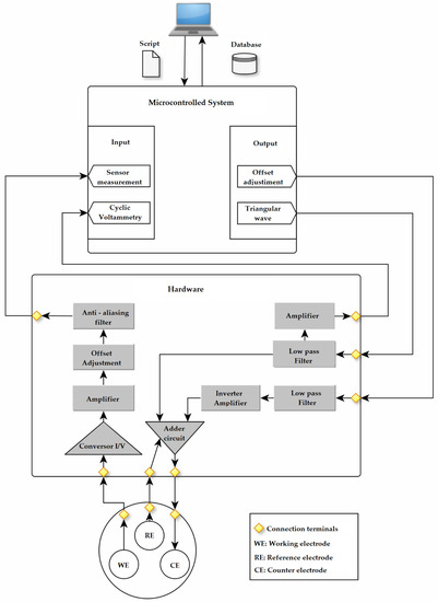 A small and portable microcontrolled platform able to sweep the desired potentials and electrochemically characterize the biosensors in the presence and absence of SARS-CoV-2 biomarker antibodies was fabricated, with an estimated analysis processing time of 3 min. The developed portable potentiostat performs cyclic voltammetry measurements and is composed of two main platforms: a micro-controlled platform and an engineered hardware connected to a computer, as shown in Figure 2. The potentiostat is responsible for exciting the biosensor between counter electrode (CE) and reference electrode (RE). Then, the device transforms the electrical current that flows through the working electrode (WE) into a measurable voltage, which is registered for data processing. The computer is responsible for processing the data, transforming it into useful information for understanding the phenomenon involved in the analysis through the MATLAB R2016b software. From the voltage measured by the potentiostat, the current of the biosensor is obtained through a mathematical equation that represents the inverse modeling of the hardware. Figure 2 shows a detailed schematic representation of the microcontrolled system.