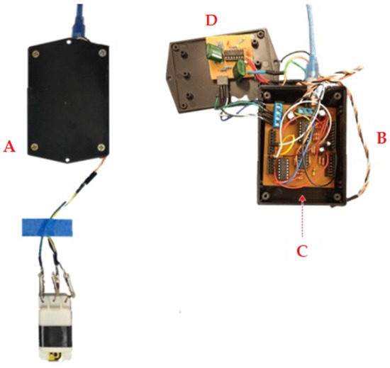Figure 3. Image of our developed portable potentiostat. (A) Bottom view of the biosensor connected to the portable potentiostat, (B) Portable potentiostat pre-filter anti-aliasing; (C) Microcontrolled Platform; (D) Anti-aliasing filter.