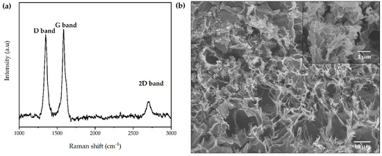 Figure 4. (a) Raman spectra and (b) FESEM of the surface microstructure of LIG produced from DLW process on PI sheets.