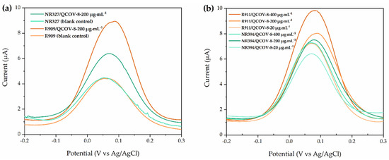 Figure 6. DPV measurements in potassium ferricyanide probe (K3[Fe (CN)6]). (a) Tests in reactive and non-reactive clinical samples containing 10 µL of a 200 µg·mL−1 of antigen solution. (b) DPV measurements of immunosensors containing 10 µL of 100, 200 and 400 µg·mL−1 of antigen solution, where R represents reactive clinical samples and NR represents non-reactive clinical samples.