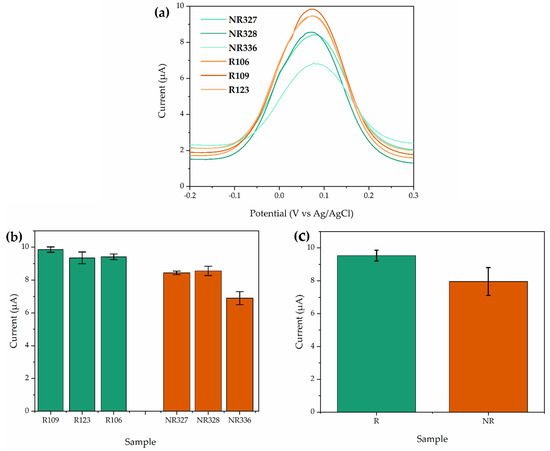 Figure 7. Analyses of reactive and non-reactive human blood serum sample for SARS-CoV-2 using the biosensor (a) immunosensor differential pulse voltammogram, in the potential range −0.2 and 0.3 V, with scan rate of 6 mV·s−1 to 0.19 V, for reactive and non-reactive clinical samples. (b) Triplicate analyses of clinical samples where the peak current was analyzed (Table 1). (c) Final mean analyzes of clinical samples in which the peak current d was analyzed (Table 1).