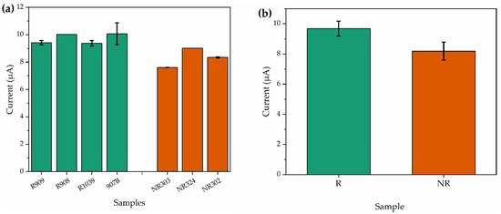 Figure 8. Cyclic voltammetry measurements of immunosensors for reactive and non-reactive clinical samples performed in the portable potentiostat. (a) Oxidation current values for R and NR samples and (b) final mean analyses of clinical specimens.