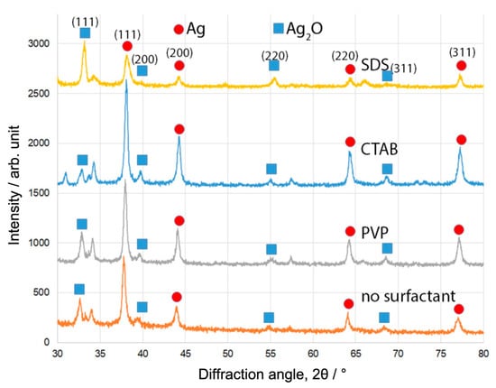 Based on the XRD analyses, STEM observations, and relevant pieces of literature [34,35,36,37,38], the formation mechanism of the Ag nanoparticles and the Ag2O skin can be proposed as below. The sputtered Ag ions/atoms in the hot plasma are quickly quenched by the surrounding liquid, aggregating with each other to form metallic Ag nanoparticles. Then, those Ag nanoparticles will react with the surfactant materials and O, OH, and H radicals dissociated from the water molecules due to the high temperature of the plasma. The dissolution of organic molecules introduced by hot plasma may take place, but it occurs only inside a tiny zone where the hot plasma is generated. Given that the duration of the electrical discharge is less than 10 μs and the gap between the two electrodes is less than 0.5 mm, the effect of the dissolution of organic molecules is negligible. As we know, there are many combinations between Ag and O, OH, H radicals [39]; thus, other metastable phases of Ag/O or Ag/OH can also be formed. Under the pulsed plasma in liquid conditions, hydroxide of silver is formed first, which immediately turns into an oxide. In this study, only Ag and Ag2O phases were observed in the final product according to the XRD analysis. The structures of the three types of surfactant materials are shown in Figure 3h. Both PVP and SDS have oxygen groups which can strongly interact with the Ag ions to form oxide particles. Given the small sizes of Ag nanoparticles (2.2 nm and 1.9 nm for PVP and SDS, respectively), a significant amount of Ag2O can be formed on the surface. However, CTAB can only react with Ag via the brome ion to form AgBr [40]. As AgBr will be quickly reduced to Ag [41], the metallic Ag nanoparticles will react with other oxidising agents to form a thin Ag2O layer. Therefore, a higher percentage of metallic Ag was produced when CTAB was used as surfactant material.
