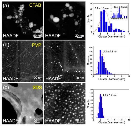 Typical HAADF-STEM images and size distributions for the Ag nanoparticles prepared using the aqueous pulsed plasma technique in the presence of CTAB (a), PVP (b), and SDS (c).