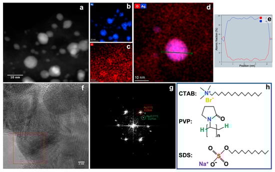 STEM image of Ag nanoparticles prepared with CTAB (a) and its EDS mappings of elements Ag (b) and O (c). EDS mapping of an individual Ag nanoparticle (d) shows the line profile (e) of the atomic fraction of Ag and O of the area marked in green in (d). HRTEM of Ag nanoparticles prepared with CTAB (f) and the FFT pattern of the nanoparticle boxed in red showing the presence of both Ag and Ag2O (g,h) illustrates the chemical structures of the three kinds of surfactant.