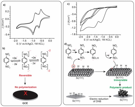 On Si–H however, and during the second CV scan, the reduction waves are slightly negatively shifted and in the third CV cycle the waves disappear suggesting that DNB is undergoing an irreversible reduction reaction and reacting with the Si–H surface. This agrees with what has been previously observed for the interaction of DNB with flavonoids in DMF []. Irreversible redox chemical characteristics of DNB were previously observed when DNB derivatives are exposed to diphenyl urea, and this was attributed to a proton transfer process from the urea to the DA species of the DNB []. In the same context, a proton transfer from flavonoids led to an irreversible reduction process of DNB, which is ascribed to a hydrogen abstraction from the flavonoid to the RA species []. Similarly, Si–H has been demonstrated to undergo oxidation at ambient conditions with proton donation from the surface to radical species in solution, leaving a radical on the Si surface [,,]. Therefore, in the presence of the RA chemical state, it is likely that a proton is abstracted from the Si–H surface, leading to irreversible reaction. In addition, this process appears to lead to a polymeric product on the surface (Figure 1d), similar to the reduction of diazonium salts on Si–H surfaces [].