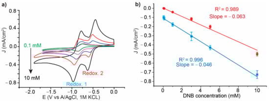 (a) CV for the evolution of the peak current vs the concentration of DNB on GCE between 0.1 mM and 10 mM. (b) Calibration curves created by plotting the peak current of the redox peak 1 (blue) and the redox peak 2 (red) against its corresponding concentration.