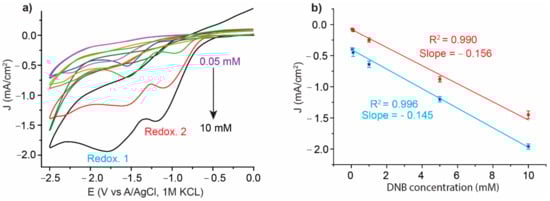 The CV from the reduction of DNB on GCE showed two reduction and two oxidation peaks, indicating that the reaction of the nitro groups of DNB with the GCE surface is reversible (Figure 1a) [,,]. The reduction of the two nitro groups leads to the formation of dinitro radical anions (RA), then dinitro diradical anions (DA) that reversibly convert back to DNB in aprotic solvent (Figure 1b), and the current increases linearly with the concentration of the analyte [].