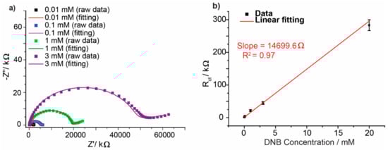 (a) Nyquist plot of the EIS for the polymeric film formed by reducing different concentrations of DNB in organic electrolyte, followed by EIS measurement in Ru (NH3)63+/2+ solution. Dots represent raw data and lines represent the equivalent Randles circuit fitting. (b) Calibration curve built from measuring the charge transfer resistance (Rct) obtained from different DNB concentrations in the range of 0.01 mM to 20 mM and fitted with a linear regression of R2 = 0.97.