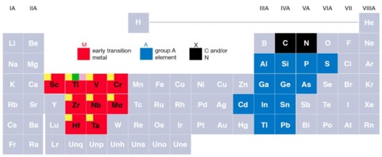 - Khazaei, M.; Arai, M.; Sasaki, T.; Chung, C.-Y.; Venkataramanan, N.S.; Estili, M.; Sakka, Y.; Kawazoe, Y. Novel Electronic and Magnetic Properties of Two-Dimensional Transition Metal Carbides and Nitrides. Adv. Funct. Mater. 2012, 23, 2185–2192. [Google Scholar] [CrossRef]