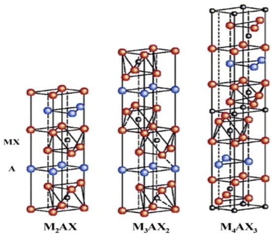 MAX phase P63/mmc symmetry. Blue balls denote the A layer atoms, red balls denote the M layer atoms, and gray balls occupying the octahedral site denote the X atoms. Reprinted with permission from ref. [11] (Eklund, Beckers, Jansson, Högberg, & Hultman, 2010). Copyright Elsevier Science B.V.