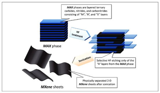 Schematic diagram of MXene formation. The blue-black layered structure (MAX phase) is treated with HF, which selectively removes the blue layers (A layer etching). The black multi-layered structure is then sonicated to yield 2D MXene sheets. Reprinted with permission from ref. [23] (Naguib, Mochalin, Barsoum, & Gogotsi, 2014). Copyright 2013 Wiley-VCH Veralg GmbH &Co. KGaA.