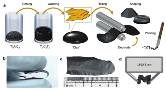- Ling, Z.; Ren, C.E.; Zhao, M.-Q.; Yang, J.; Giammarco, J.M.; Qiu, J.; Barsoum, M.W.; Gogotsi, Y. Flexible and conductive MXene films and nanocomposites with high capacitance. Proc. Natl. Acad. Sci. USA 2014, 111, 16676–16681. [Google Scholar] [CrossRef] [Green Version]