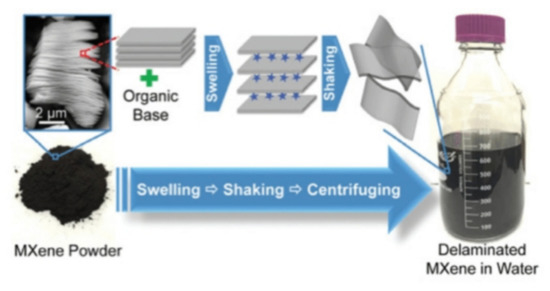 Schematic representation of delamination process of MXene. Reprinted with permission from ref. [65] (J. Zhu et al., 2017); Copyright 2017 Elsevier B.V.