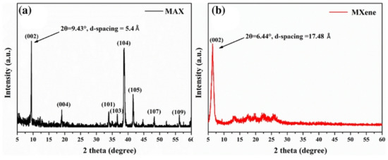 XRD data of (a) Ti3AlC2 MAX phase and (b) Ti3C2TxMXene. It is clear that, except for the (0002) peaks, all other peaks in the MXene data almost vanished. Also, there is a downward shift of angle from 9.43° to 6.44° and a d-spacing increase from 5.4 Armstrong to 17.8 Armstrong. Reprinted with permission from ref [71] (Sheng et al., 2021). Copyright Springer US.
