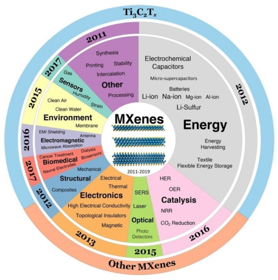 - Gogotsi, Y.; Anasori, B. The Rise of MXenes. ACS Nano 2019, 13, 8491–8494. [Google Scholar] [CrossRef] [Green Version]