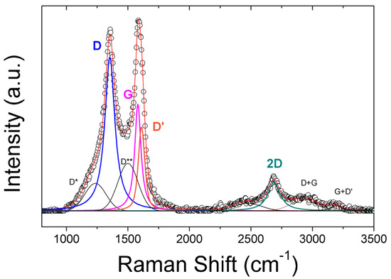 Figure 1 reports a typical Raman spectrum of the rGO used to elaborate the nanocomposites. Carbon-based materials exhibit several characteristic Raman vibration modes. The C-sp2 lattice vibration results in the well-known G-band (~1580 cm−1) present in graphite, carbon nanotubes, graphene, GO, and rGO. The D-band (~1350 cm−1) results from point defects vibration and is the most intense peak in GO and rGO-based materials. The D’ band is the first-order vibration mode of aromatic rings, while the 2D band is the second-order vibration mode of this structure. In ideal pristine graphene, the free π electrons are all confined in aromatic rings. Consequently, the relative intensity of this band should be twice higher than the G band in an ideal graphene sheet [73]. The intensity ratio between the 2D and G bands is a parameter often used to assess the quality of the rGO-based materials. Our samples exhibit I2D/IG = 0.28, which is comparable to the quality of rGO according to the study of Kaniyoor and Ramaprabhu [74].