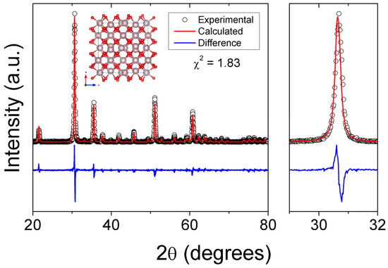 Figure 2 presents an X-ray diffraction pattern for an In2O3 sample prepared by the polymer precursor method described in Section 3.1 after heat-treating the resin at 500 °C. This oxide crystallizes in a cubic symmetry (space group Ia3). The lattice parameter was estimated at 1.01 nm through the Rietveld refinement. The refinement converged fast and yielded a goodness-of-fit of 1.83 and crystallite size estimated at 59 nm. The inset of Figure 2 shows a schematic representation of the typical bixbyite structure of In2O3.
