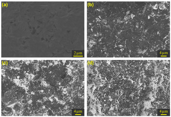 Scanning electron microscopy images of (a) rGO and its mixture with (b) 5, (c) 15, and (d) 50 v/v% of In2O3 nanoparticles suspension.