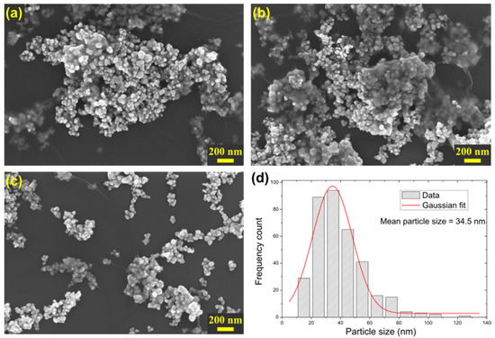 Scanning electron microscopy image of samples prepared with (a) 5, (b) 15, and (c) 50 v/v% of In2O3 nominal compositions. (d) Particle size distribution and a Gaussian fit with an average particle size of 34.5 nm.