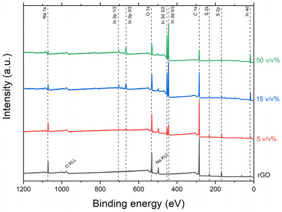 Figure 3 depicts SEM images of drop-casted nanocomposites samples. It is possible to observe in these micrographs that the amount of these In2O3 nanoparticles increases with the sample’s nominal composition. For example, Figure 3a–d show that the amount of nominal In2O3 nanoparticles increases from 0 to 50 v/v%. The Image J software [72] was used to estimate the surface area ratio between In2O3 nanoparticles and rGO (AIn2O3/ArGO). This ratio was calculated for the images in Figure 3b–d and was found to be 20.1%, 29.2%, and 46.3%, respectively. These results demonstrate that it is possible to tailor the chemical nature of the exposed surface to the atmosphere of such nanocomposites.