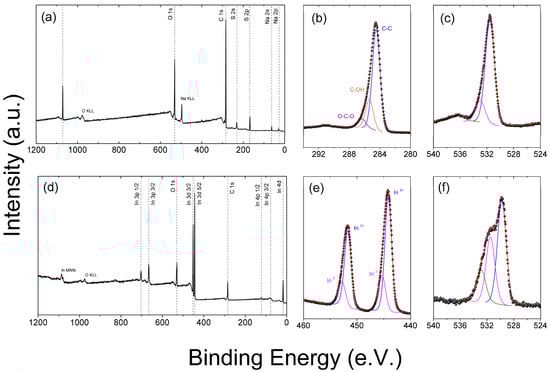 Typical X-ray photoelectron spectra of the commercial (a–c) rGO and synthesized (d–f) In2O3. (a,d) corresponds to survey spectra, (b,e) to high-resolution C 1s, and (c,f) to high-resolution O 1s.