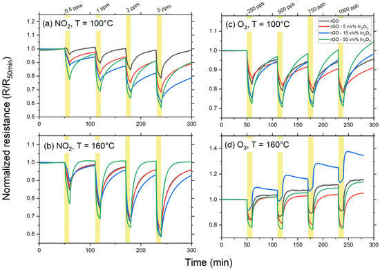 rGO-based gas sensors are well-known to exhibit high and fast responses towards NO2. Figure 7a,b present a dynamic response-recovery dataset of four sensors prepared with an increasing nominal composition of In2O3 nanoparticles to prepare the nanocomposites, as described in Section 2 of this manuscript. Two features should be noted in these figures. One is that the In2O3 nanoparticles tend to increase the sensors’ response towards NO2, which can be explained by the formation of p–n heterojunctions between p-type rGO and n-type In2O3 [69]. Moreover, the second feature is that the devices’ responses are higher as the operating temperature increases.
