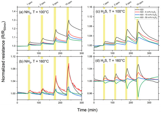 Figure 8a,b report the sensing behavior of rGO–In2O3-based sensors towards NH3 controlled exposure at 100 and 160 °C. Interestingly, the addition of In2O3 nanoparticles has a negative impact on the sensing properties of rGO towards ammonia. A decrease in the sensor response is observed as the In2O3 nanoparticles’ nominal composition increases. Moreover, the response decreases when the operating temperature increases. For example, the response ΔR/R0 calculated for pure rGO and rGO-50 v/v%-In2O3 at 10 ppm of NH3 is 15 and 6%, respectively, when operating at 100 °C. To compare, the response ΔR/R0 for 10 ppm of NH3 is 17% to 9% for pure rGO when operating at 100 and 160 °C, respectively.