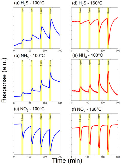 While such microsensors are insensitive to gaseous species not involving redox reactions with the sensing nanocomposite (such as BTEX), they remain not selective to one of the target pollutants. Nevertheless, it remains possible to identify the nature of the pollutant present in the probing gaseous phase using two identical microsensors working at two different temperatures. Figure 9 shows the response of two sensors prepared with rGO–50 v/v%–In2O3. The curves shown in the left panels are related to the signals from a sensor operating at 100 °C, while the curves at the right panels are the signals delivered by the sensor operating at 160 °C. As can be seen in this figure, the interaction with H2S produces a positive electrical resistance variation on the sensing element operating at 100 °C (Figure 9a), while a negative electrical resistance variation is observed for the sensing element operating at 160 °C (Figure 9d). On the other hand, a positive variation of the electrical resistance in both sensing elements indicates that the devices interact with NH3. If both elements exhibit a decrease in electrical resistance, the target gas must be NO2. The recognition method is based on studying the various function of the resistance during a few seconds of sensor exposure to gas. Table 2 summarizes how H2S, NH3, or NO2 can be discriminated by this method. Once the gas has been identified, the microsensors exhibiting the best sensing performances can be used to quantify gas concentration. Consequently, our measurements open new perspectives for studying rGO–SMOx-based gas sensors in the multi-sensor array or electronics nose context [84], since rGO–In2O3 nanocomposites could readily differentiate these two common cross-reactive species [85]. Additionally, a further experimental investigation is necessary to assess the influence of environmental humidity on the gas sensing properties of rGO–SMOx nanocomposites and to further comprehend the reaction mechanism towards both NH3 and H2S.