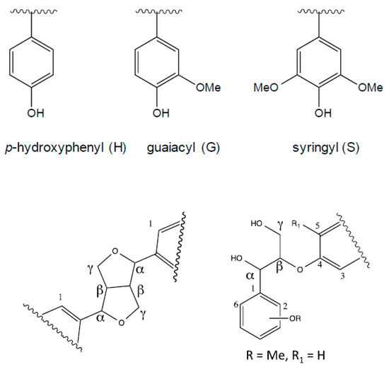 Lignin is the second most abundant renewable bio-resource in nature, after cellulose. It is an amorphous high molecular weight complex biopolymer with heterogeneous aromatic structure, derived mainly from p-coumaryl, coniferyl and sinapyl alcohols, with a total worldwide production of approximately 26 million tons per year. Unlike cellulose, which consists of single intermonomeric linkages, lignin has no structural regularity within its polymeric framework. In lignin macromolecules, the monomeric units p-hydroxyphenyl (H), guaiacyl (G) and syringyl (S) are linked by a variety of carbon–oxygen and carbon–carbon bonds (Figure 1). Lignin is manufactured from low-cost natural precursors, such as woody plants and paper mill wastes. The use of lignin as a precursor to carbonaceous materials has gained interest due to its high percentage of aromatic residues, low cost, and high availability [1,2,3,4].