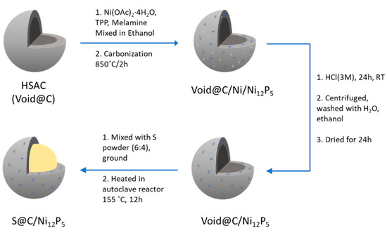 Figure 2 depicts the total synthetic scheme for the S@C/Ni12P5 cathode material. Nickel-rich phosphides are polar and show conductivity similar to that of metals (>5000 S·cm−1) [45]. As a result, they can bond with polysulfides, relieve the shuttle effect, and amplify redox reactions. In this study, we decided to synthesize Ni12P5 rather than Ni2P because the higher Ni content was expected to have a higher conductivity [46]. During the synthetic reaction, Ni2+ was reduced to metallic nickel as a catalyst, leading to the growth of N-doped HSACs and phosphorus released from triphenylphosphine combined with Ni to generate Ni12P5 nanoparticles. We selected melamine because it is known to disintegrate into intermediate C2N2+, C3N2+ or C3N3+ species as carbon and nitrogen sources [47]. HCl was used to etch away Ni metal formed during the phosphinylation process, leading to the formation of Void@C/N12P5. The S@C/Ni12P5 cathode was obtained by sulfur infiltration of Void@C/N12P5.