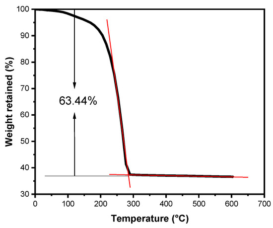 Figure 3 shows the result of the TGA analysis used to quantify the amount of infiltrated sulfur in the cathode. We targeted ~60 wt.% of sulfur loading because if too much sulfur was added, it could cover the outer surface of the carbon host and block the flow of Li+ ions through the cathode structure [48]. TGA showed that sulfur was completely evaporated from the sample in the range of 150–400 °C in the amount of 63.4% of the mass of the sulfur–carbon composite.