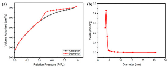 Figure 4a displays the BET absorption and desorption characteristics of the carbon host (Void@C). The sample possessed a very high SSA (1832 m2·g−1), high pore volume (0.738 cm3·g−1), and suitable pore diameter (3.608 nm) (Table 1). These numbers are far superior compared to the industry standard, KB (vide supra). Especially, low pore diameter is very important for high depth of discharge of sulfur, which is an insulator. The HSAC sample displayed a sorption type IV isotherm shape with low adsorption at low relative pressures and a significant rise at P/P0 > 0.8. This isotherm is common in many mesoporous industrial adsorbents, where the mono-layered surface coverage of the pore walls is followed by capillary condensation or pore-filling [49]. The data demonstrated that the carbon material possessed both micro and meso pores (Figure 4b). A higher surface area gives a higher contact interface between the sulfur and the carbon matrix, leading to good electron transport properties. A higher pore volume is also an essential factor because it gives the housing space needed for sulfur impregnation. This prevents the coating of sulfur on the surface when the pore size is not of adequate size and/or sulfur exceeds 60 wt.% [48].