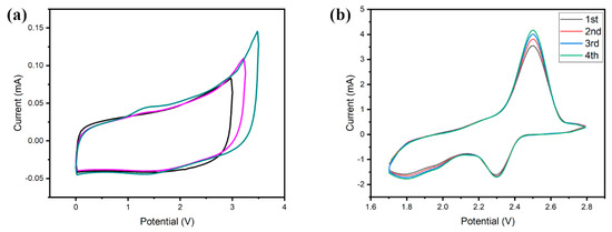 Figure 7 presents the CV results of the performance of both the supercapacitor (Void@C) and Li-S (S@C/Ni12P5) cell samples. The supercapacitor cell was measured in three different voltage windows: 0 to 3.0 V, 3.25 V and 3.5 V at a scan rate of 1 mV·s−1. All of the CV profiles maintained a near-rectangular shape in the middle, indicating ideal reversible capacitive behavior. As the voltage increased, however, it caused the shape of the curves to distort slightly. This is due to oxidation or reduction reactions involving charge transfer across the electrolyte–electrode interfaces, displaying sharp increases or well-defined peaks in the current [51]. The specific capacitance (Cp) with respect to the integral CV area was calculated using the following equation: