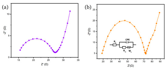Figure 8 shows the Nyquist plots of both of the energy storage devices. The supercapacitor (Figure 8a) shows a single semicircle with an ohmic resistance (R0, Z’ intercept) of 12 Ω and a charge transfer resistance (Rct, semicircle radius) of 12 Ω. The inclined line of NN degrees at low frequencies (high Z’) indicates the electrical double layer capacitive properties and fast ion transport through the electrolyte to the inner pores [54]. A typical impedance plot for an Li-S cell is composed of one or more flattened semicircles at the high and middle-frequency regions and one linear diffusion drift at the low-frequency region. The semicircles in the high-frequency (HF) and middle-frequency (MF) regions are related to charge-transfer resistance and the formation of a solid film of Li2S and Li2S2, respectively [55]. However, some literature suggests that the MF semicircles may be caused by polysulfide generation, and the inclined line in the low-frequency region is indicative of inner diffusion processes [54,56]. For the Li-S cell (Figure 8b), the HF resistances, R0 and Rct, are 16 Ω and 48 Ω, respectively. The beginnings of a second semicircle are visible but cut off by the diffusion response at low frequencies. Furthermore, both EIS plots can be fitted with an equivalent circuit as in the inset in Figure 8b, where CPE is the constant phase element, R0 represents the electrolyte ohmic resistance displayed by the semicircle in the high-frequency region, Rct corresponds to the charge transfer resistance as well as the diameter of the semicircle, and W0 denotes the Warburg impedance and is displayed by the inclined line (dotted) in the low-frequency region [57,58].