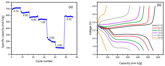 Figure 10a displays the step-cycling discharge capacity of the Li-S cell for 8 cycles at each designated current density. A dramatic decrease in the discharge capacity occurred when the rate switched from 1.0 C to 2.0 C. The specific capacity of the 5th cycle at 1.0 C was measured to be 538 mA·h·g−1, whereas the specific capacity was only 192 mA·h·g−1 at 2.0 C. In addition, during the current density change from 1.0 C to 2.0 C, it took 4 cycles to stabilize the cell. The reason for the drastic drop might be due to stagnant electrode kinetics. When the current density was switched back to 0.2 C, the specific capacity of the cathode recovered to ~90% of its previous capacity (644 and 582 mA·h·g−1).