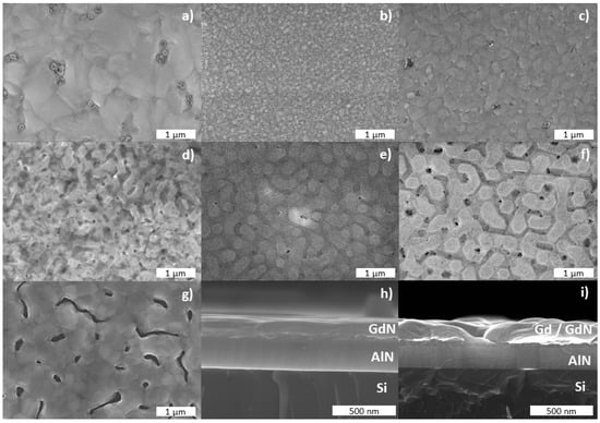Secondary electron SEM mages of (a) 80 °C, (b) 210 °C, (c) 240 °C, (d) 255 °C, (e) 270 °C, (f) 330 °C and (g) 400 °C Gd films grown on AlN (0001) samples and cross sections of the (h) 330 °C and (i) 400 °C films. Cross sections were prepared by inducing a clean fracture in the underlying Si wafer.