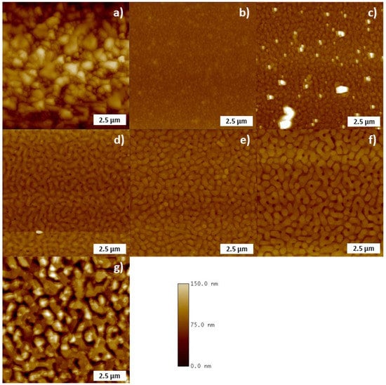 AFM imaging revealed very similar morphological development as the secondary electron SEM imaging, with nodular films progressing to hexagonal island–trench systems with increasing growth temperature (Figure 2). AFM also revealed increasing trench depth with temperature (increasing from 255 °C to 400 °C). Additionally, AFM imaging highlighted very fine hexagonal particles on the surface of the island–trench film structure at 255 °C (Figure 2d); these structures were not visible in the secondary SEM.