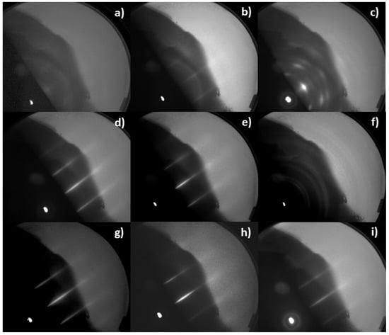 RHEED images of (a) 80 °C, (b) 210 °C, (c) 210 °C rotated 90°, (d) 240 °C, (e) 255 °C, (f) samples after 30 min annealing at 255 °C, (g) 270 °C, (h) 330 °C and (i) 400 °C films grown on AlN (0001) samples.