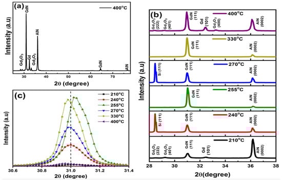 XRD pattern of (a) 400 °C annealed Gd film grown on AlN (0001) sample, (b) comparison of Gd films grown on AlN (0001) samples annealed in different temperature 210 °C, 240 °C, 255 °C, 270 °C, 330 °C and 400 °C, (c) showing the shift in the samples at 2θ = 31°.
