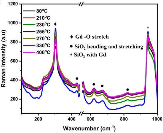 Raman spectra showed peaks at 230, 307, 434, 620, 670, 819 and 942 cm−1 (Figure 5). The plot of spectra for the films has a break from 450 cm−1 to 550 cm−1 to avoid the strong Raman peak from the Si substrate, which suppresses the intensity of other peaks. The strong peak at 307 cm−1 has been assigned as Gd–O stretching, which is attributed to the formation of Gd2O3 [36]. Given that samples were not passivated, Gd at the film surface would have likely been oxidized to form Gd2O3. Given the lack of strong Gd peaks from XRD measurements, it is likely that the Gd was either converted into the nitride by solid-state diffusion during deposition or oxidized into Gd2O3 during exposure to the atmosphere between growth and both Raman and VSM measurements. Gd2O3 is paramagnetic at room temperature, with a low peak magnetization on the order of single-digit emu/g [37,38]. Gd2O3 content in Gd films has been shown to reduce film susceptibility [2], which suggests that the presence of Gd2O3 in the samples grown in this study limited the maximum magnetization. The peak at 942 cm−1 has been assigned to the combination of SiO2 with Gd [39]. The peaks at 434, 620, 670 and 819 cm−1 are SiO2 bending and stretching modes.