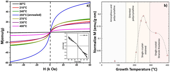 Field-dependent magnetization curves varied drastically with growth temperature of the GdN/Gd/Gd2O3 films (Figure 6). The magnetization of the films showed an S–type behavior, except for the 80 °C film which exhibited weak linear paramagnetism. Magnetization curves had a similar nature to the Langevin function [36]. The inset in the figure shows the perfect diamagnetism of the substrate AlN/Si. When increasing the field, magnetization was increased up to 60 K Oe, and no hysteresis loop was observed, revealing that the films grown at 210 °C to 400 °C exhibited superparamagnetic behavior. The annealed sample (255 °C growth temperature) showed a slightly higher thickness-normalized magnetic saturation relative to the 240 °C and 270 °C films (Figure 6b).