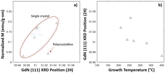 Thickness-normalized magnetization as a function of GdN (111) 2θ peak position (a), and GdN (111) 2θ as a function of growth temperature (b). Note that the samples showing single-crystal layer-by-layer growth (supported by RHEED measurements) show a correlation with increased magnetization for increased 2θ (departing literature bulk value, indicating more stress in the film); the polycrystalline sample (grown at 210 °C) departs from this correlation.