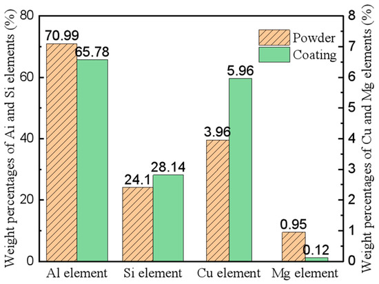 Figure 4 shows the elemental contents of Al, Si, Cu, and Mg in the powder and coating measured by ICP technique. Since the average surface temperature of the droplets is above 2500 °C, much higher than the boiling points of Mg (~1107 °C) and Al (~2400 °C), the evaporation of these elements occurred, leading to the almost disappearance of Mg element after spraying. Differently, the Si displayed an increase of about 4 wt.%.