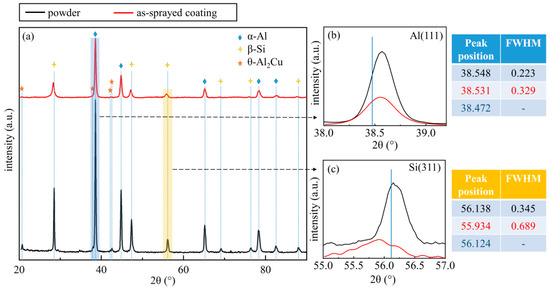 XRD patterns of the powder and coating. (a) Al-25Si-4Cu-0.9Mg powder and Al-25Si coating; (b) Al(111) diffraction peak; (c) Si(311) diffraction peak.